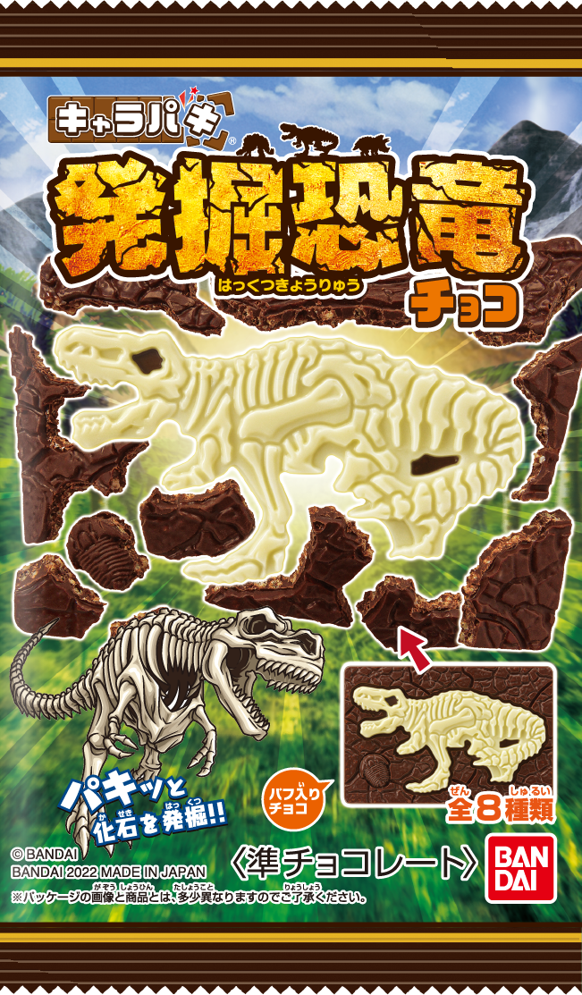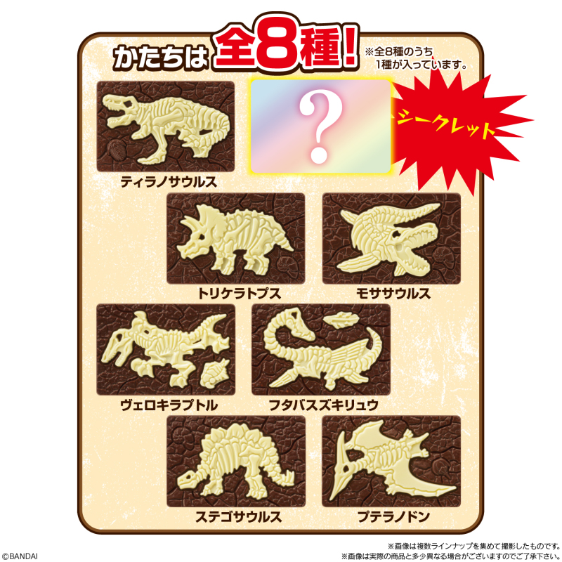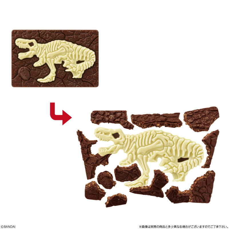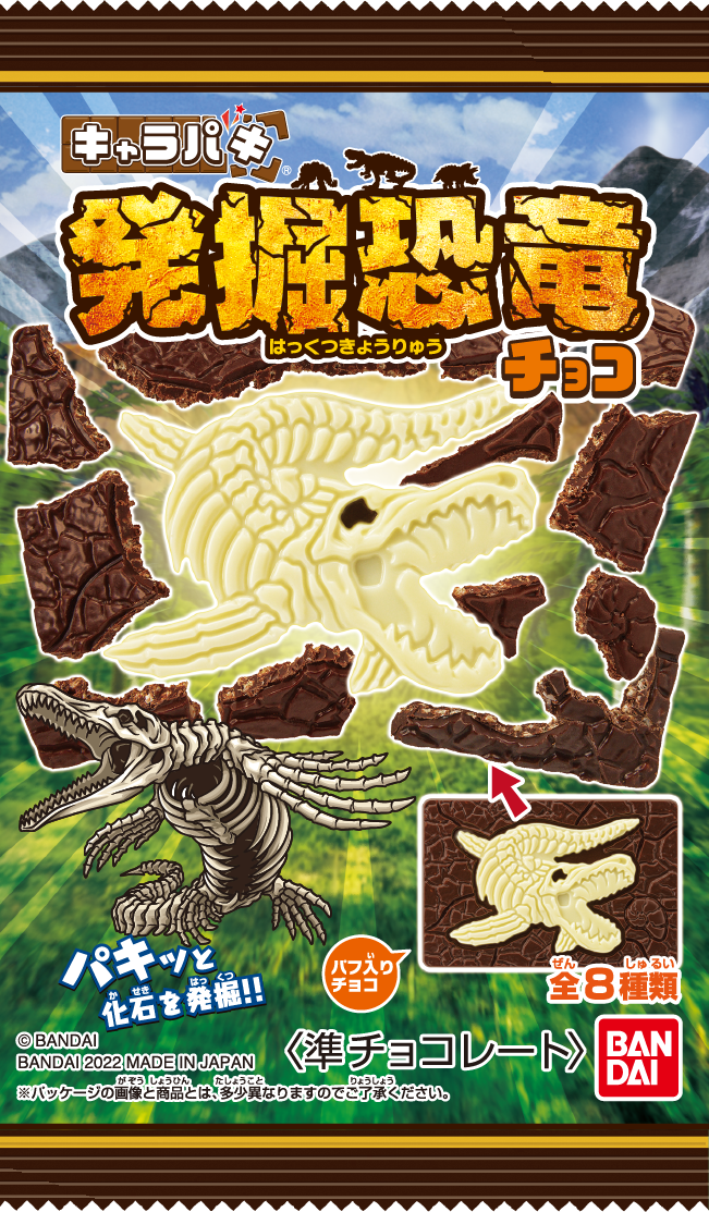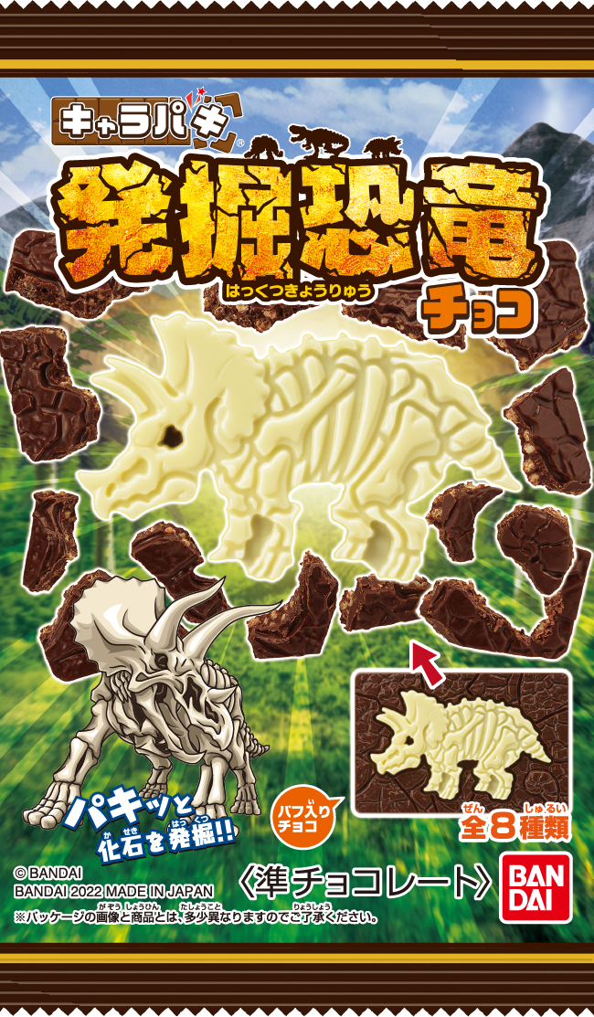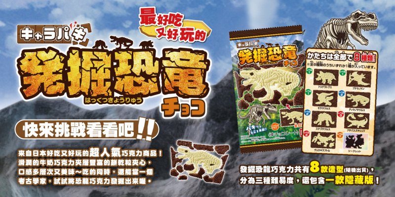 主打能邊吃邊玩、享受考古樂趣的「萬代 發掘恐龍巧克力風味糖」,以多層次口感的滑潤牛奶巧克力夾層、豐富餅乾粒夾心為主體,並在其中設計有白巧克力的恐龍化石造型,收錄有:暴龍、三角龍、無齒翼龍、劍龍、雙葉龍、伶盜龍、滄龍等 7 款人氣恐龍,另外還有超帥的隱藏版!