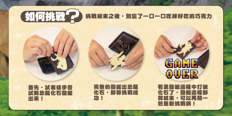 根據不同造型的恐龍化石,總共有三種難易度;透過手或是各種創意小道具,將白色的恐龍巧克力完整取出就算挖掘挑戰成功!但如果發掘過程中不小心把化石敲破,發掘過程就結束啦~請再開一包重新挑戰吧!