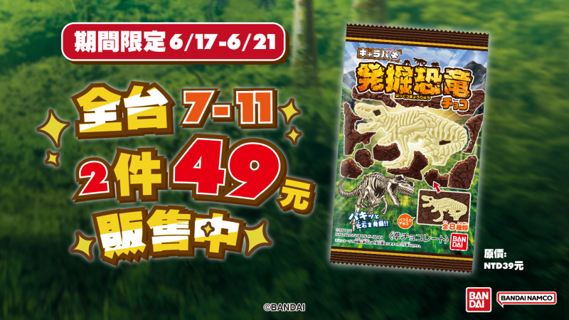 日本萬代玩具公司旗下食玩事業部「BANDAI CANDY」所推出的超人氣商品「發掘恐龍巧克力風味糖」,將於 6 月 17 日~ 21 日在全台 7-11 便利商店展開限時五天的優惠活動,兩件只要 49 元!好吃又好玩、喜歡恐龍的大朋友小朋友千萬不要錯過,快來挑戰吧!