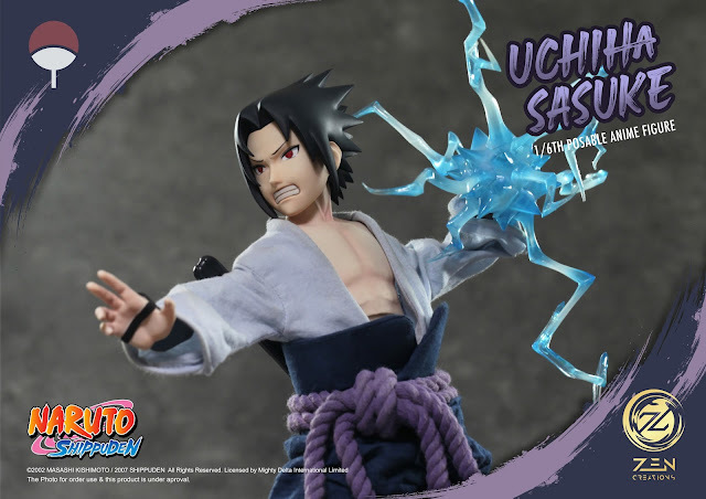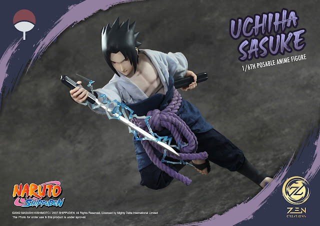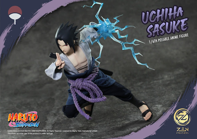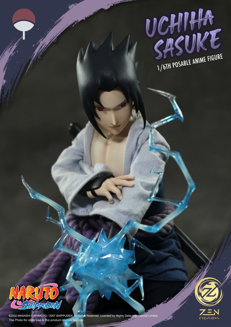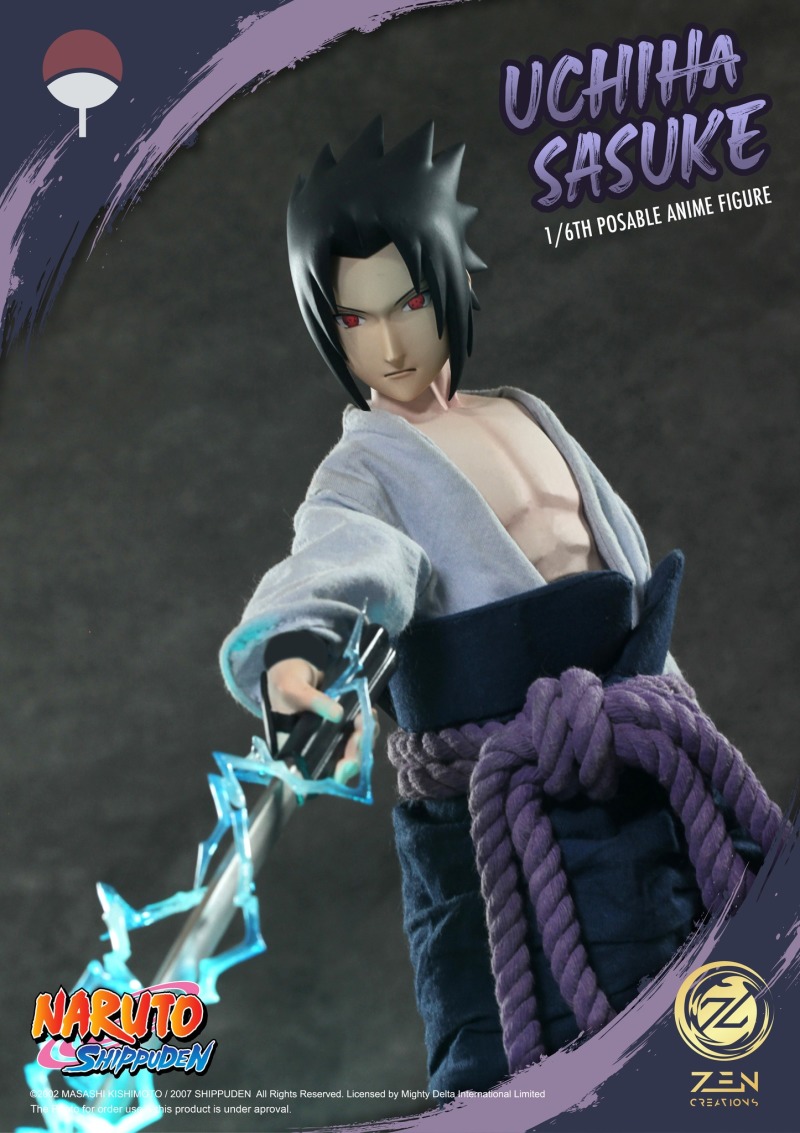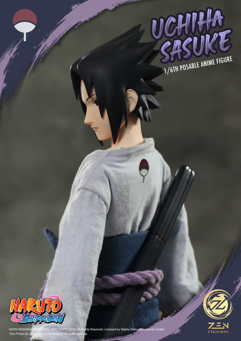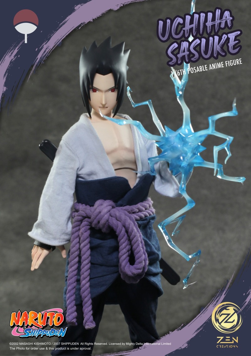 由 Zen Creations推出的「宇智波佐助」1/6比例可動人偶,以疾風傳中的造型呈現,全高約 28 公分,全身超過 30 個可動關節,還原劇中造型!背後有宇智波家族徽章的淡紫藍色服飾、腰繩採用布製打造;除了臉上冷酷的招牌表情,還附有紅色瞳孔的寫輪眼、戰鬥臉等臉部替換零件,搭配 11 款造型手掌替換零件、替換頭髮和千鳥、千鳥刃、草薙劍等特效道具,能賞玩激烈的戰鬥姿態!