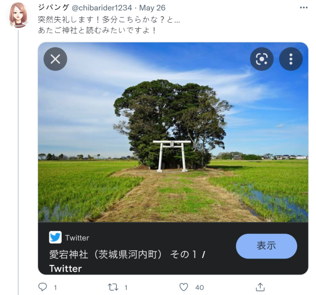 而推主拍攝的這張稻田中神社,也被網友發現存在在日本茨城縣河内町的「愛宕神社」,其實在當地也是個觀光經典,聳立在稻田裡的神社鳥居也吸引不少外地客來朝聖。根據網友解釋,其實也是當地為了祈求稻作豐收興建的神社,如果時間合宜,就可以跟推主一樣拍攝到神社旁水稻的美麗場景。