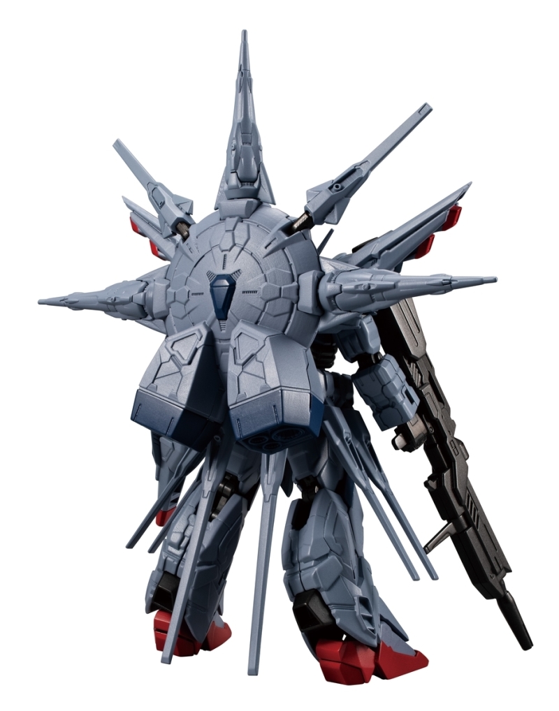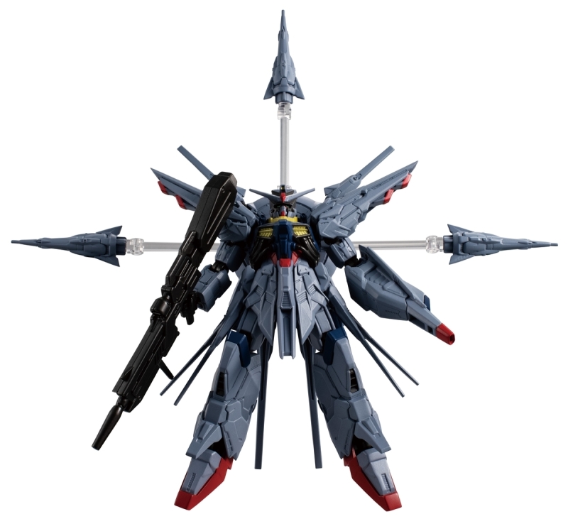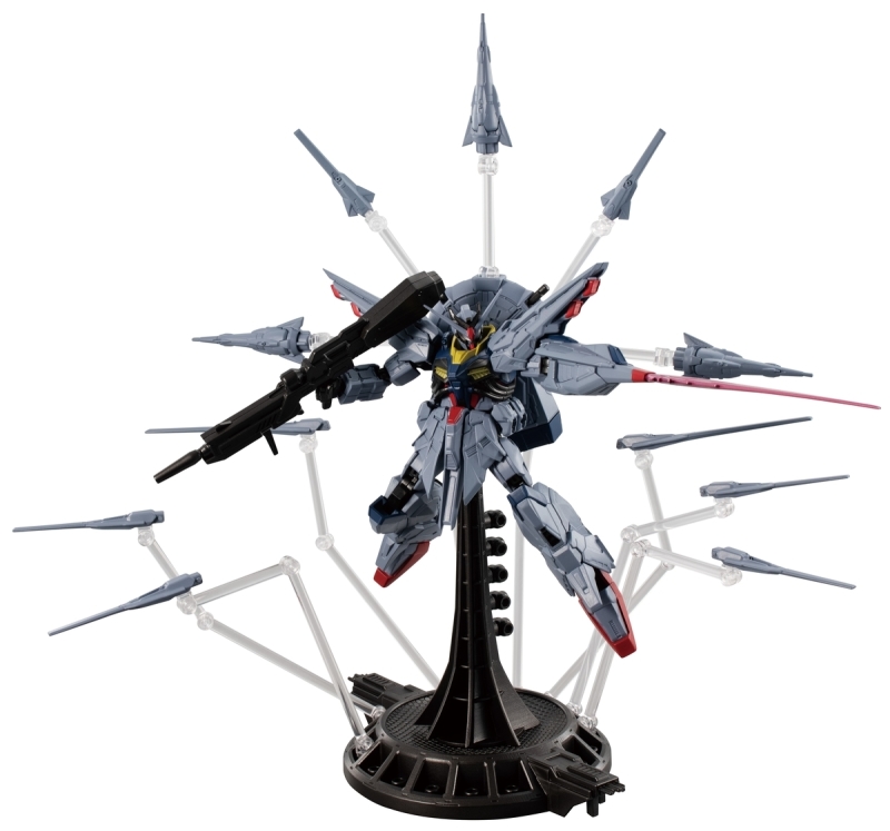 在武裝部分不僅具備尺寸相當大的「審判式」大型光束步槍,搭載左臂的複合兵裝防盾系統也能再現大型光束軍刀展開的模樣。全身 11 具龍騎兵系統光束砲除了基部設有可動機構外,更能透過內附的多組透明支架連結底座,再現全部發射的場景!
