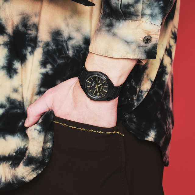 設計整體採用服裝配色設計,以黑色搭配金色的整體外觀給人一種尊貴的氣息,文字「天上天下 唯我獨尊」更是代表 Mikey 自負又有能耐的性格。錶背有著Mikey 的圖像與限定數字,購買另附有專屬盒裝以及紀念特典卡片。限量 400 副。