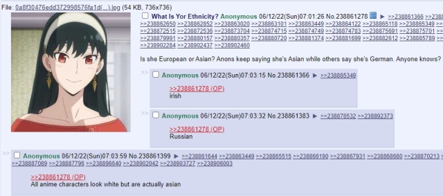 原PO一開始問的是「約兒究竟是亞洲人還是德國人」,但底下的閒聊則是什麼答案都有,「愛爾蘭人」、「俄羅斯人」、「所有動畫角色看起來都是白的,但是他們通通都是亞洲人」、「她叫Yor,她弟叫Yuri,用用你的腦袋啊」......