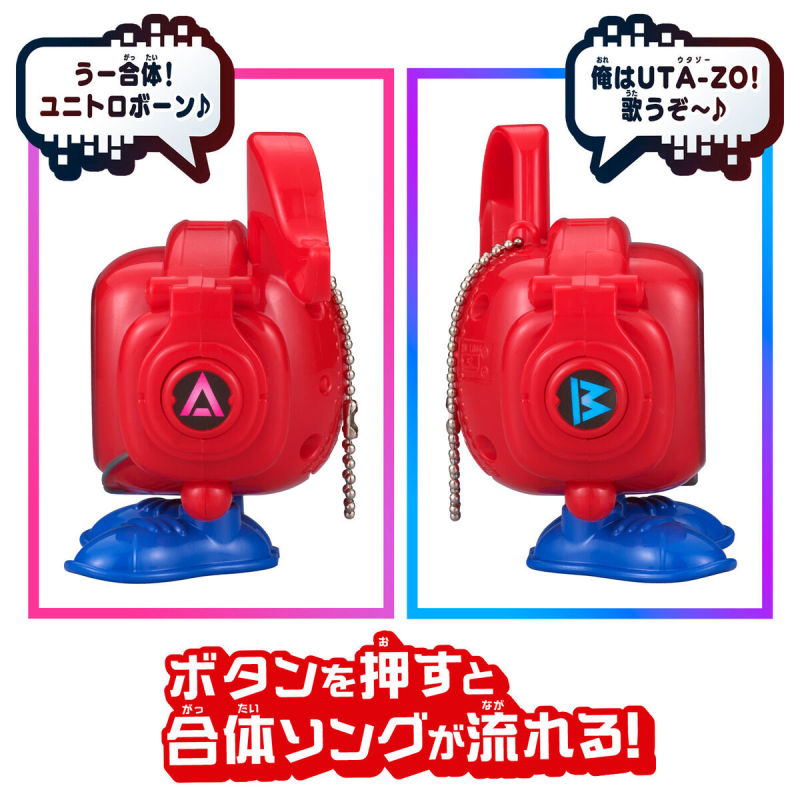 玩具將推出能播放超洗腦合體歌曲與各種台詞、音效的「UTA-ZO」,以及「蘋果螯龍蝦」、「計程車樹木」、「推土機漢堡」、「甲蟲蒸汽火車」、「飛機橡皮擦」「鯊魚自販機」等 6 款組合顏色相同卻難以聯想的 UNITROBO,保持物體原型的同時也內藏巧妙的變形合體機構,能合體成令人意想不到的機器人姿態!
