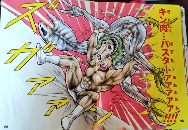 哪尼 ! 怎麼後面突然出現了漫畫版本的金肉人,還裸著身體只穿小短褲施展「金肉爆裂」 !