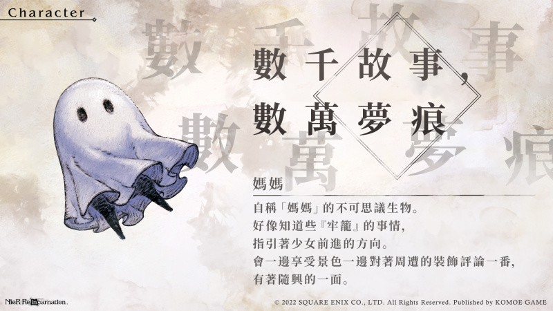 《NieR Re[in]carnation》角色概念圖由吉田明彥操刀,採用濃厚低沉的上色方式,呈現一種厚重的手繪風格,不需要任何注解和描述,映入眼中的畫面本身,就是一個故事。