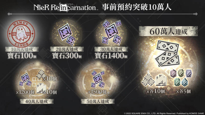 目前《NieR Re[in]carnation》預約已突破10萬人,感謝玩家對此遊戲的期待與對系列作的熱誠!現已成功解鎖獎勵「100個寶石」,當所有目標達成後,總計還能獲得免費4500個寶石(相當於15次轉蛋)、3張高級轉蛋券與大量養成素材獎勵!
