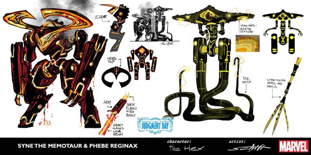 負責復仇者、X戰警與永恆族的大事件《審判日》(A.X.E.: Judgment Day)的繪師Valerio Schiti日前公布了他對於這個永恆族當中的分支群落「The Hex」所做的外型設計,以及介紹他們的降臨所將帶來的事物。他表示這六位永恆族是「無人能擋」、「無可避免」且又「原始」的,百萬年來都在沉睡之中,而他們身負的永恆詛咒就是殺戮與破壞。即使如此,他們並不是無腦的殺戮機器,而是具有複雜思想的生物,但又因為缺乏明顯的情緒而沒有臉孔的設計。