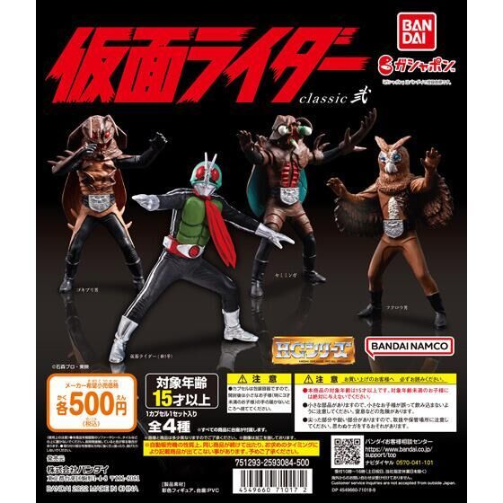 本次的「HG 假面騎士classic貳」轉蛋共有四種款式,在約 8.5 公分的高度裡再現了劇中的經典角色,包含有假面騎士新1號、蟑螂男、鴞人、音波怪人賽敏加,以精密造型與塗裝刻劃各具特色的服裝、腰帶,生動的動作和招牌姿勢,絕對是假面迷必入手的收藏!