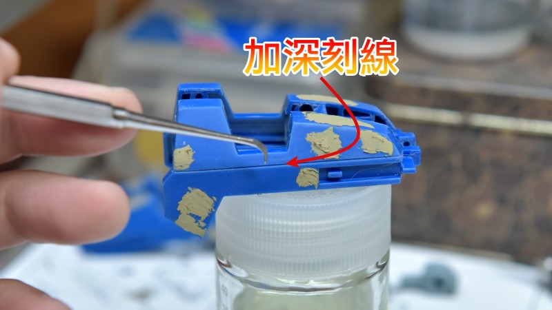 ▼再來可以準備一隻牙籤或是竹籤或是任何不傷模型表面的尖刺物都可,直接在溝槽附近輕輕地繞圈將遮蓋膠帶往下壓到溝槽裡面。