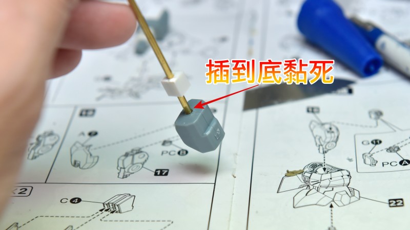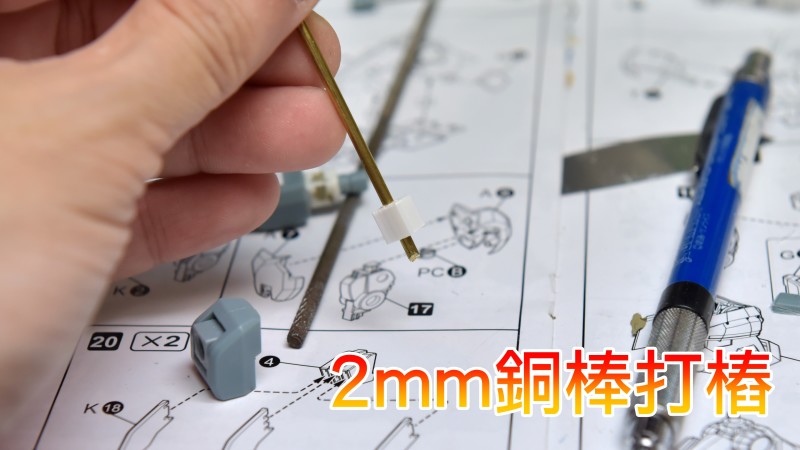 ▼大腿孔位剛好也是2mm所以直接將貫穿的銅棒插底後黏死。這邊推薦使用401膠水這瓶還不錯用只要沾上一點點就能夠讓銅棒和零件非常牢固不會有拔樁問題那怕只有沾到一點牢固性也是很夠。