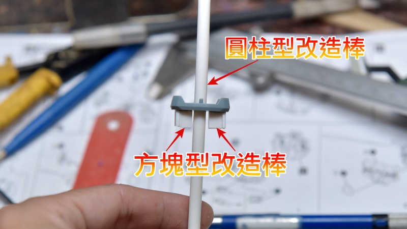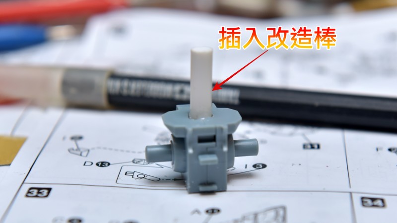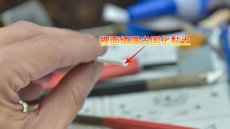 ▼直接拿出一根空心的改造棒裡面填滿光固化黏土,填滿後再用紫外線燈照射讓黏土固化。最後在鑽孔使用401黏在原套件上。我手頭上沒有實心的改造圓棒如果有其實可以不用這樣做直接用實心的鑽洞套上去就好。