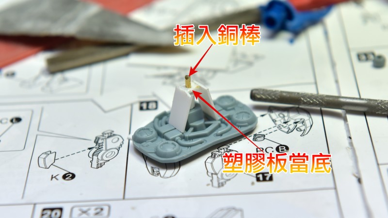 ▼最後直接左右後三面貼上膠板當頸部的骨架,改造棒上記得貼上一塊塑膠板當球型關節的底最後中間記得打入一根同棒。(無須貫穿)