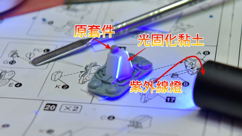 ▼使用紫外線燈照射,通常這種面積很小的範圍大概照個一分鐘就能完全固化而且很好打磨,簡單的說就是完全硬化的照射時間要看你本身黏土的體積大小。