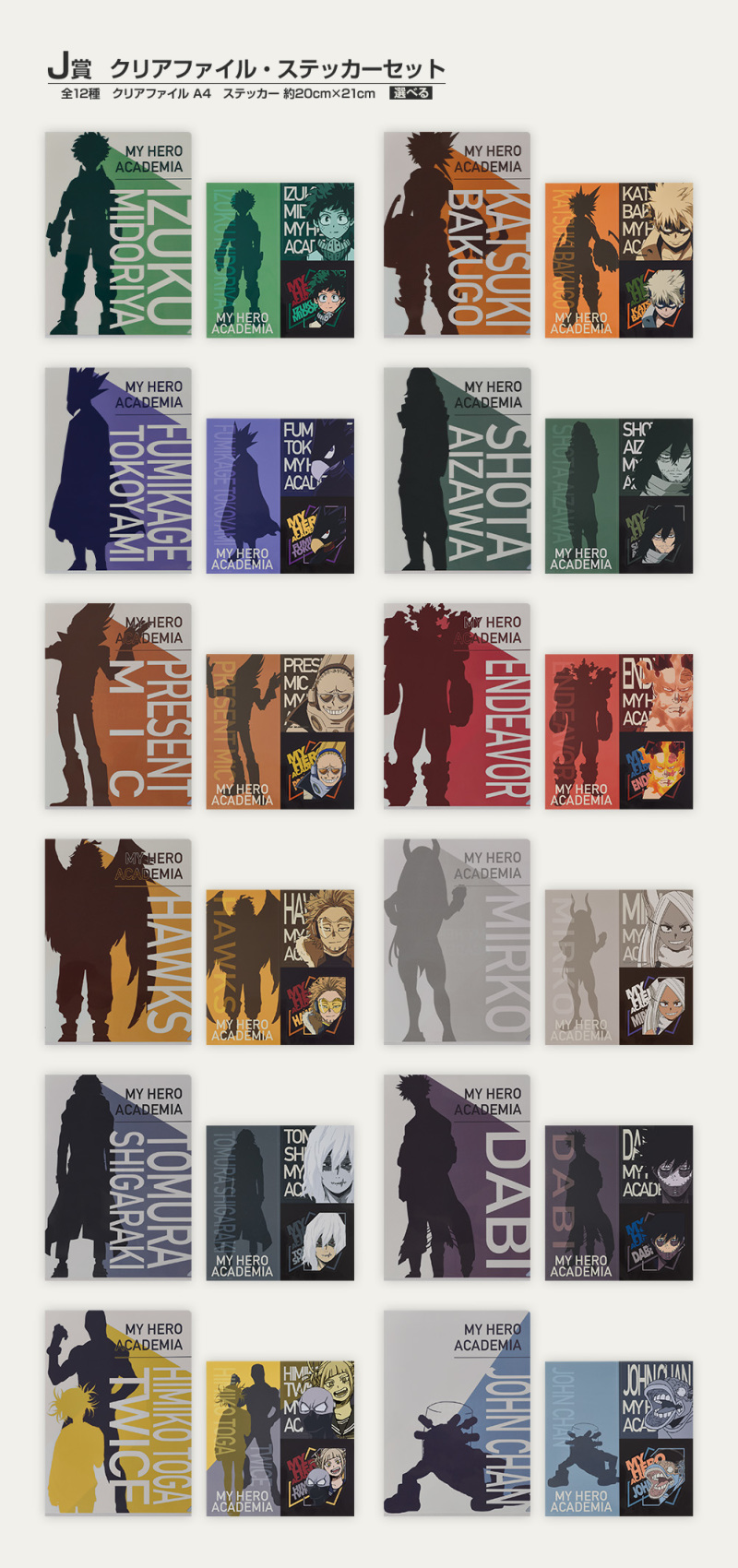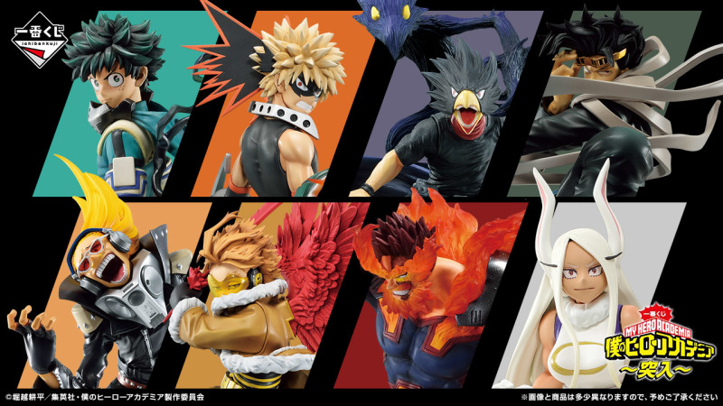 「一番賞 我的英雄學院 ~突入~」,預計將推出 A~L 與最後一賞、雙重機會賞等 14 個不同級別的賞品,目前公開了8款豐富的角色模型,收錄有A賞 綠谷出久、B賞 爆豪勝己、C賞 常闇踏陰、D賞 相澤消太、E賞 禮物麥克風、F賞 奮進人、G賞 霍克斯、H賞 米爾科,細膩再現各角色的特徵與精緻的服裝細節!另外還有磁鐵、文件夾與毛巾等經典的一番賞獎品!