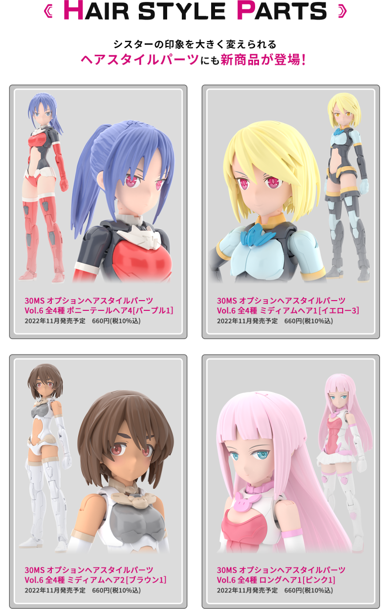 同樣在 11 月 30MS 系列還會推出最新的「髮型配件套組 Vol. 6」,包含馬尾髮型4[紫色1]、中短髮1[黃色3]、中短髮2[棕色1]、長髮1[粉紅色1]等四種,能夠對應 30MS 全系列角色使用,自由變更每位 SISTER 的形象。