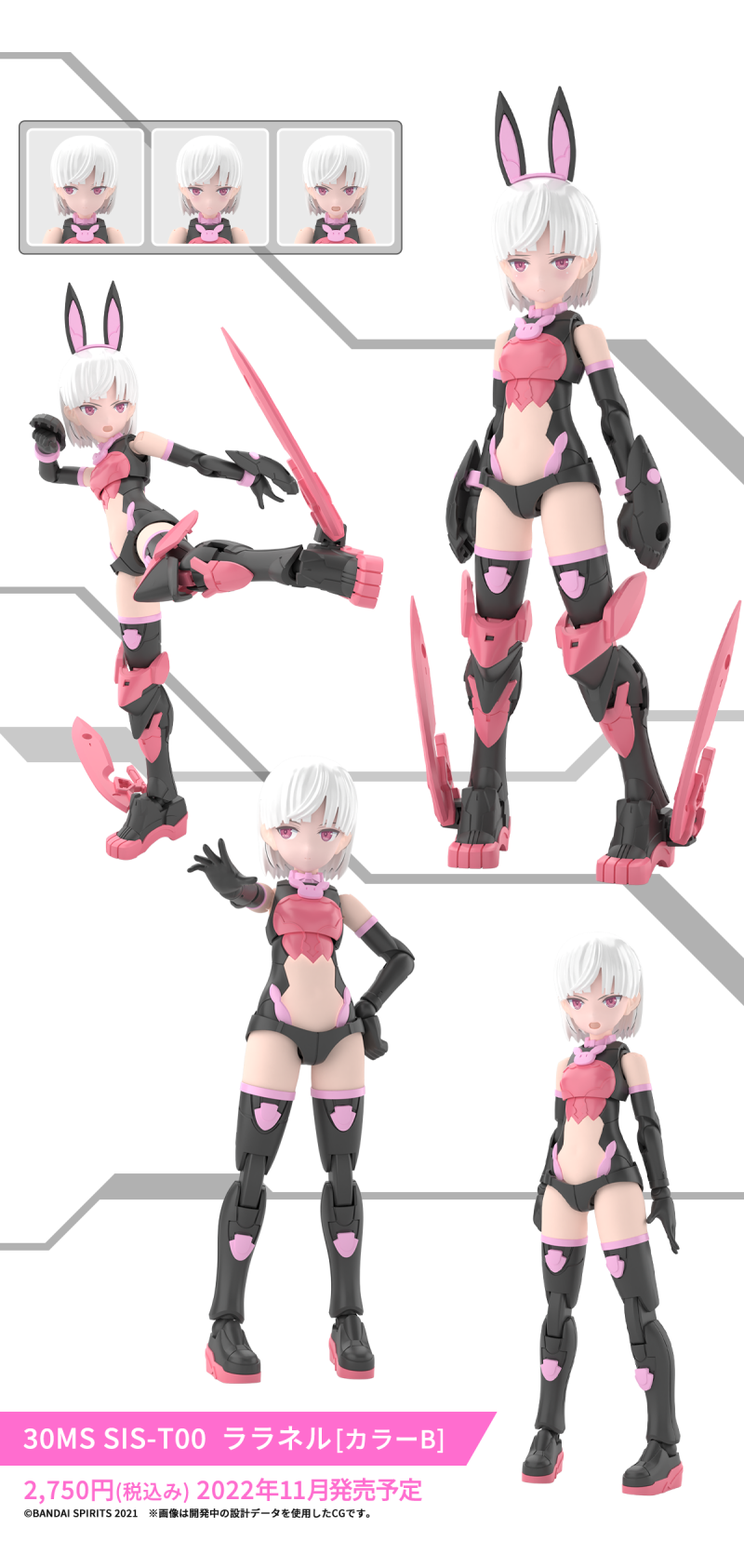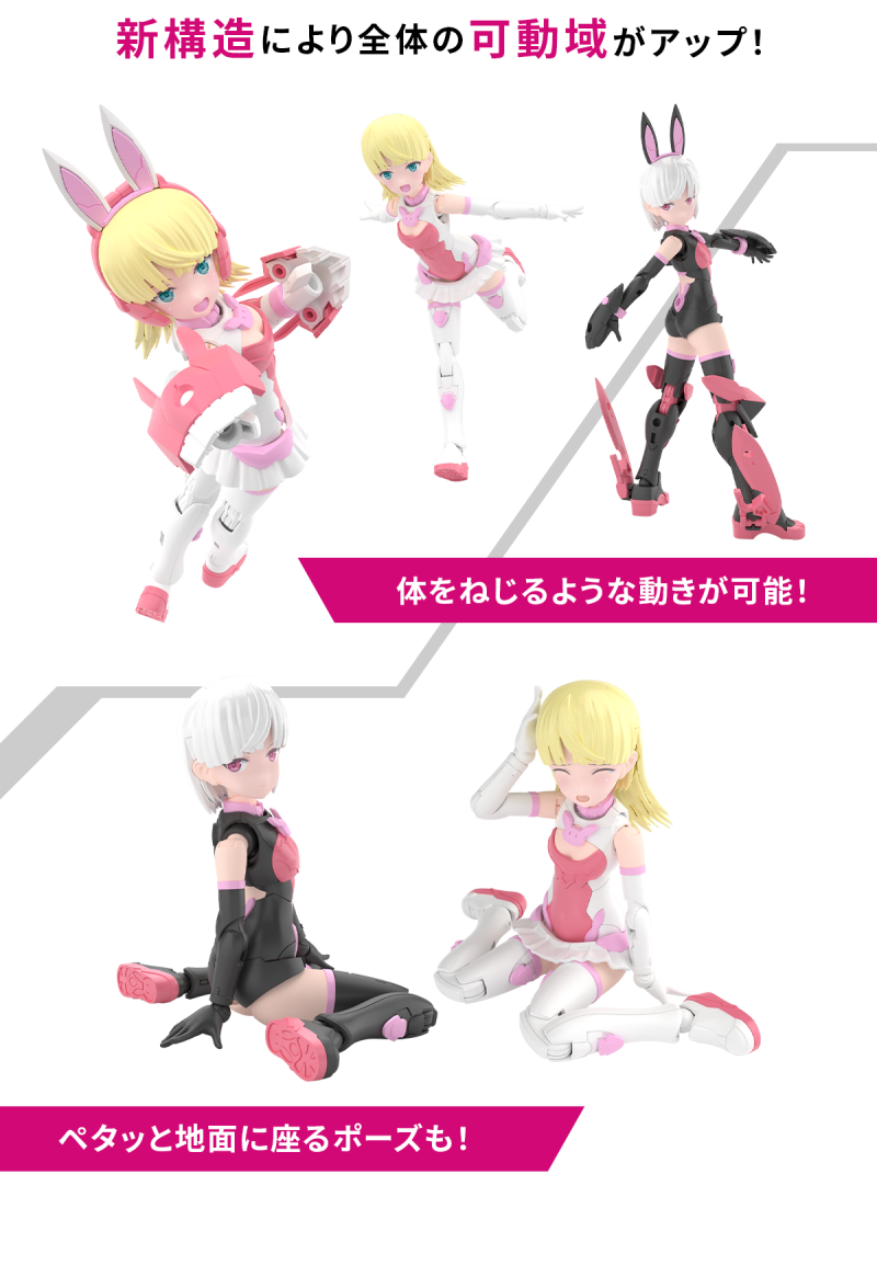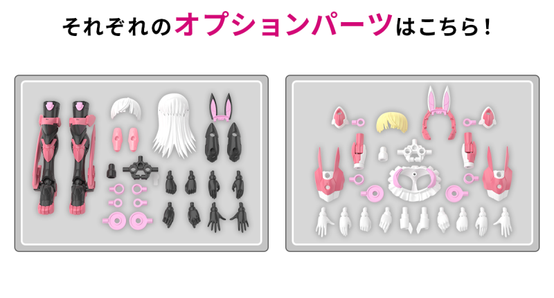 兩款商品分別採用白兔、黑兔的意象進行設計,是包含角色素體、表情零件、裝甲零件的全套商品,此次商品採用新型素體零件,除了再現具備兔子意象的可愛造型外,整體尺寸比一般 30MS 素體還要嬌小,可動範圍則更為提升,能夠把玩出相當自然的姿勢,搭配各自附上的 3 種表情零件表現生動情感。
