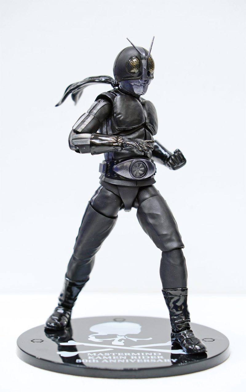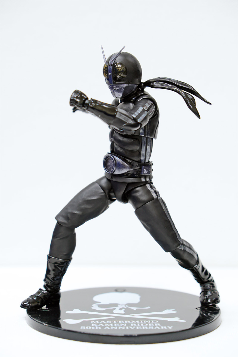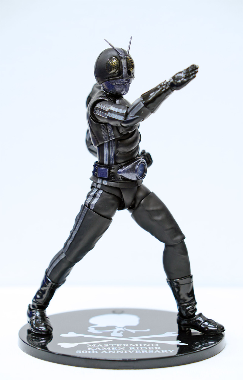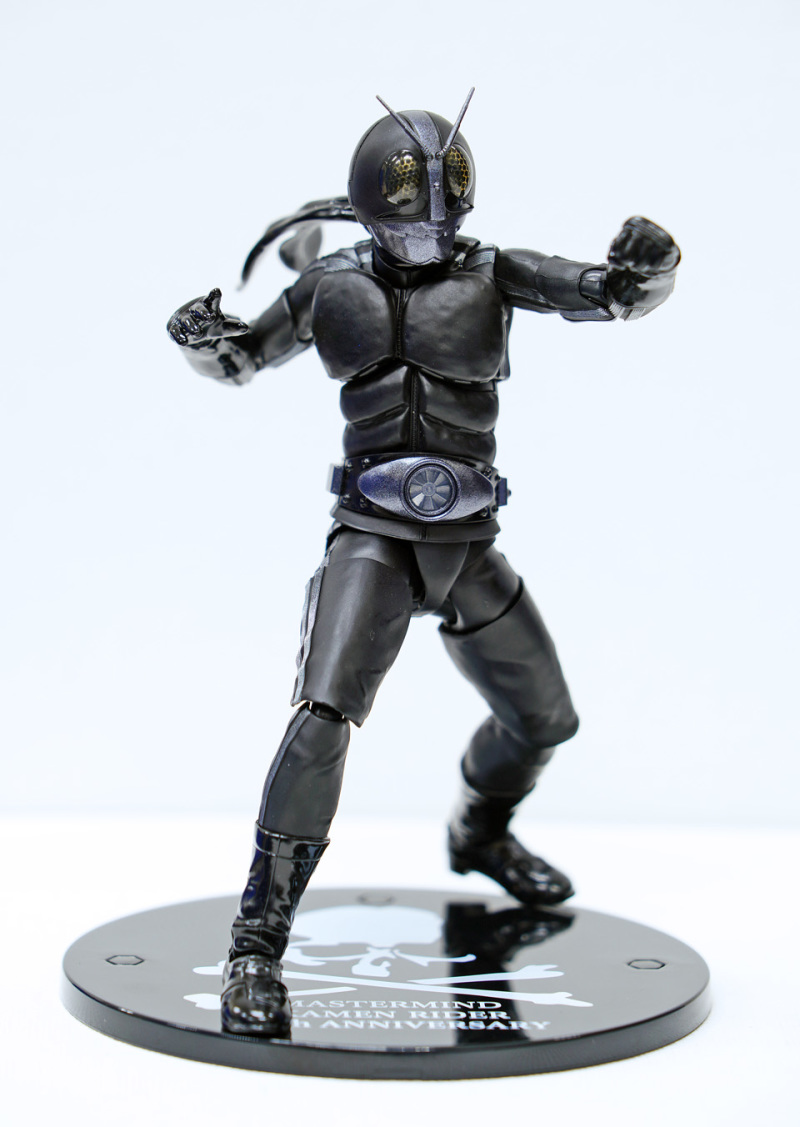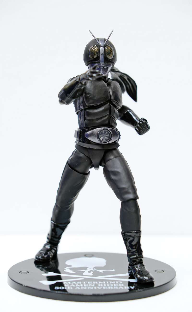 新一號全高約 145mm。整體造型、規格、可動設計基本與過去推出的版本相同,而塗裝配色則採用 Mastermind 的黑、灰、銀配色,另運用了深淺配色帶來更突出的形象。同時配件中還附上印有「 Kamen Rider x masterMIND 50周年記念台座」(否則你也不會入吧)。真骨雕的外型還原了皮套的外觀。QC 合格,頭盔有輕微溢色!全身各部分關節可動性不俗,想擺劇中任何姿勢也不用擔心。太棒了!