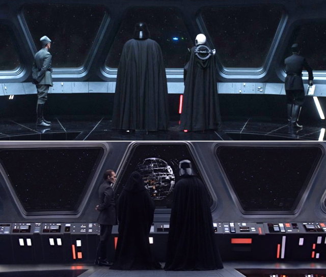 另一邊,歐比王一行即便逃離了賈賓,超光速引擎故障之下依舊陷入窘境,遭維德驅逐艦緊咬不放。這緊張的情節如同第五部曲《帝國大反擊》的重演,背景也使用了該電影的配樂旋律(千年鷹號逃離貝斯平那段)。艦橋上我們可以看到大判官與維德大君並肩而站,有著第三部曲《西斯大帝的復仇》結尾維德與皇帝看著死星雛形的既視感。