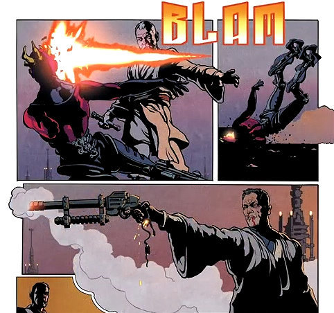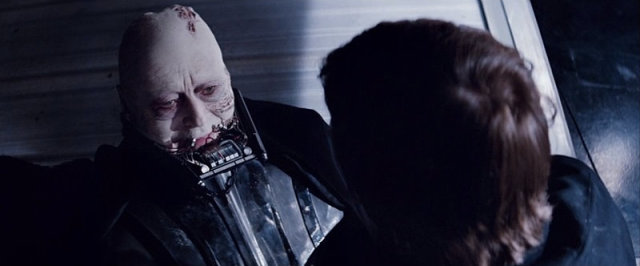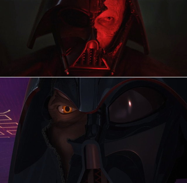 宿命的師徒對決終於來到了轉捩點,歐比王狠狠砸爛維德胸前的儀表板,並給予最後一擊,砍爆了他的面罩。大家應該知道維德整套盔甲實際上是個維生系統,胸前的控制面板不僅是重要設備同時也是弱點,隨著該裝置被破壞,也能聽見他開始發出《絕地大反攻》劇中(維生系統被皇帝的閃電破壞)同樣的喘息。面罩的破口露出底下安納金早已被毀容的臉,這情節也發生在動畫《反抗軍起義》第二季完結篇,亞蘇卡一樣砍爆了維德的面罩,差別只在於是左半邊。