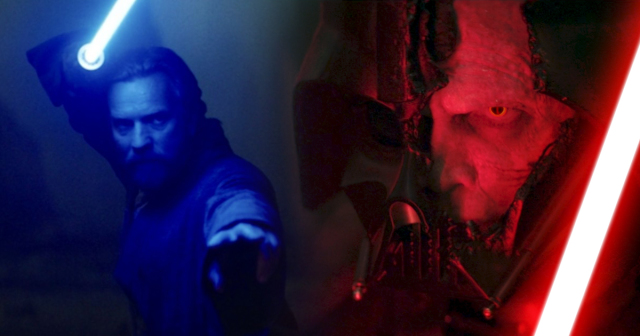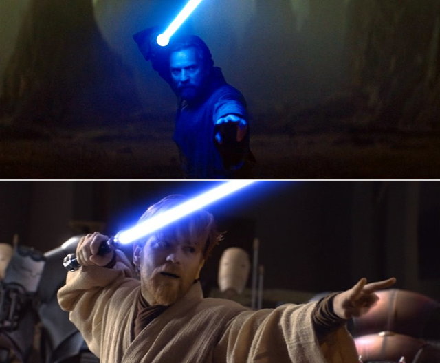 隨著面罩半毀,觀眾也能聽見詹姆斯厄爾瓊斯(James Earl Jones)的維德,與海登的安納金聲音彼此交錯。見到昔日好友如今的慘況,歐比王當下反應也跟亞蘇卡一樣脫口而出「安納金」,心中頓時湧現無比懊悔。這段也藉由光劍的光芒反射,看到安納金臉上忽藍忽紅,彷彿是映照出他內心善與惡的交雜。