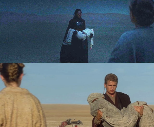 同時發生,瑞娃在夜色中來到了歐文的農場,為了她私自的正義,欲手刃維德的子嗣。歐文夫婦要路克躲起來,騙他突斯肯沙人要來襲擊,路克當下回「我不怕」,就如《帝國大反擊》他對即將接受尤達的訓練所表示的(尤達:你會怕的)。即便有傷在身,復仇心切的瑞娃依舊咄咄逼人,與護子心切的夫妻檔展開激烈的攻防。話說當然不太一樣,但歐文手持的這根棒狀物還真有點眼熟?
