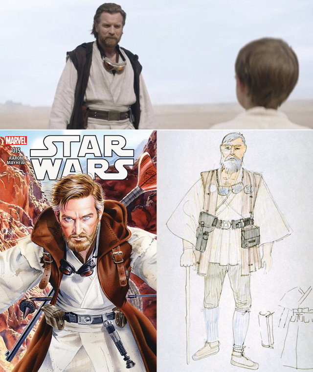 返回塔圖因的歐比王打包行李搬出久居的洞穴,接下來我們可以看到他的穿著就和 2015 年漫畫《星際大戰》第 15 回(Star Wars 15)封面上一致,感覺是要進行銜接,不過實際上該故事的時間點原本是設定在本影集的一年前(10 BBY),這部分日後可能會進行調整,不然有太多連續性上的矛盾與衝突。此外,該造型源出應是來自當初 John Mollo 所繪製的美術概念圖。