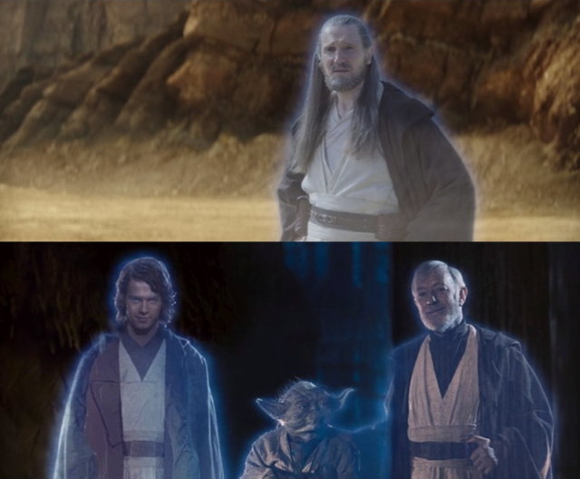 最後一幕,歐比王獨自騎著尤皮獸來到一座山谷入口,一位老友無聲地現身了,他正是觀眾期盼已久的地表最強… 不對,是絕地大師魁剛金。連恩尼遜再次飾演這個角色,不意外地作為最後的壓箱寶登場,他表示其實自己一直都在,只是歐比王尚未參透之中的奧秘。這實際上並不是歐比王第一次與恩師的英靈對話,在動畫《複製人之戰》第三季,他就曾在至尊家族的莫蒂斯巨石見過魁剛。師父對前徒弟表示前面還有很長的路要走,接下來應該就是要去打造我們熟悉的那個新居所了,歐比王會藉魁剛的教導習得真正的不朽之術,路克日後也將多次受益於化作英靈的歐比王。