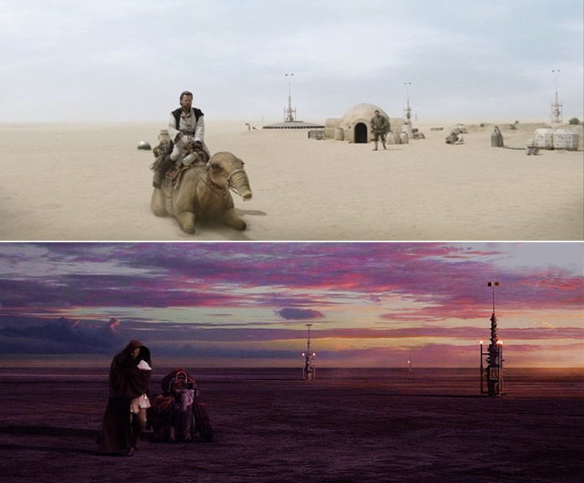 鏡頭返回沙漠,從小販那得到警告,歐文帶路克回家,馬上就與妻子蓓魯(與前傳一樣由 Bonnie Maree Piesse 飾演)討論,決定備戰死守家園。為防範有人盯上路克,叔叔嬸嬸早有準備,過去在非正史的短篇《舊傷》(Old Wounds,2005)也有過類似的情節,這漫畫描述逃過一死的達斯魔誓死追殺歐比王,來到塔圖因對路克造成威脅誘使仇敵現身,最終還是敗在歐比王手下,然而給予其最後一擊的卻是歐文。該故事強調了歐文叔叔保護路克的決心,不過即便在昔日的舊史體系依舊不被視為正史,然而達斯魔的「復活」日後在動畫《複製人之戰》劇中成真,初期造型亦相當雷同。