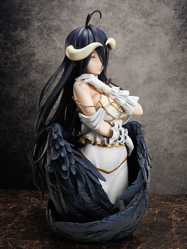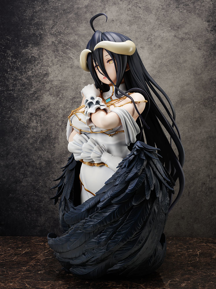 「F: NEX 雅兒貝德 1/1 比例胸像」,尺寸全高約 90 公分,以出色的的造型力打造出絕世美女形象的純白惡魔,純白的衣裝、金色飾品造型細膩,襯托出雅兒貝德豐滿的姣好身材!包覆身體的黑色羽翼更是仔細賦予一片片羽毛細節!黑色髮絲、皮膚和呈現柔順、光澤質感,搭配迷人的表情,讓人忍不住想觸摸啊!