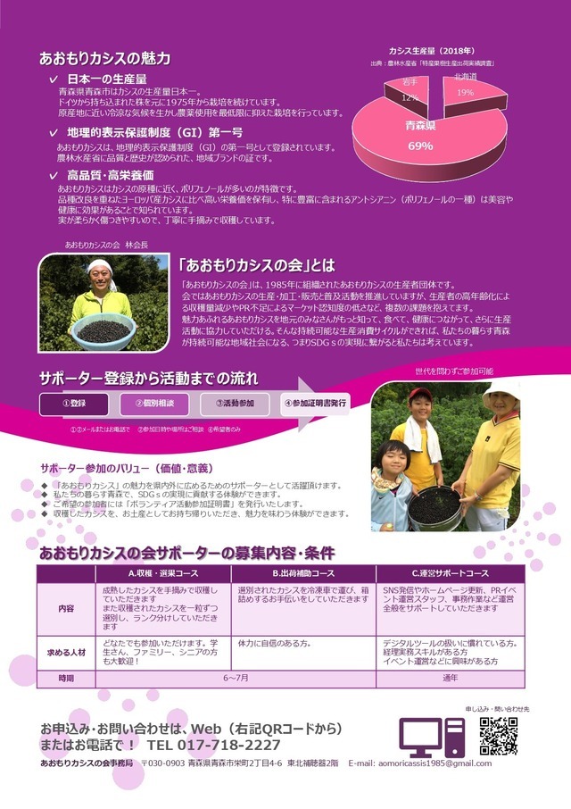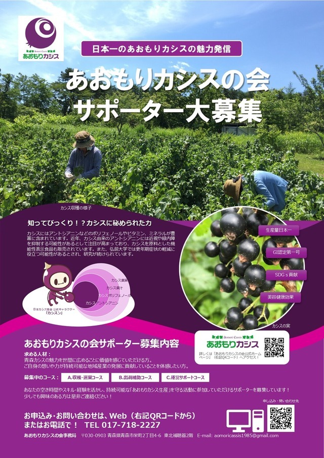 顧名思義,黑加侖子會(あおもりカシスの会),就是類似產銷班那樣,專門產銷黑加侖子的聯合組織。由於人口高齡化和地球暖化的關係,黑加侖子的產量減少、人手也不足,因此他們先前在「東奧日報」上登報募集協助採果、出貨、經營的志工。