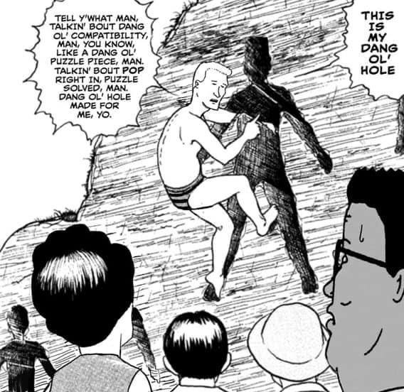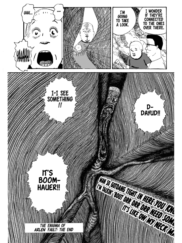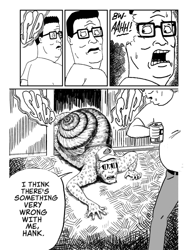 必須強調的是,成人卡通《一家之主》實際上是一部具有諷刺搞笑的情境喜劇,而在Woodrow White的筆下巧妙地與伊藤潤二老師的特色作為結合,使得整張作品給人的感覺…說是恐怖嗎?但看到主角Hank Hill的滑稽模樣,卻又忍不住笑了出來XD