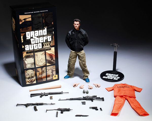 為了慶祝"俠盜獵車手3代"發行10週年,Rockstar Games推出了遊戲主角Claude限量的12吋人形,一位準備向黑道組織、街頭幫派以及警察復仇的前科犯。Claude限量的12吋人形完全忠實呈現遊戲中的打扮,身穿工作褲以及飛行外套,並且配備了一件自由市監獄的連身制服。此外,還配備了盜獵車手3代遊戲中的經典武器,包括了:球棒、匕首、手榴彈、手槍、狙擊槍、衝鋒槍以及兩把步槍。