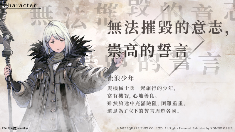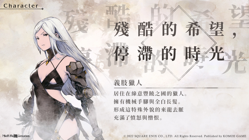 日本知名遊戲廠商 Square Enix 旗下《尼爾》系列首款手遊《NieR Re[in]carnation》(尼爾:重生),今日(24日)宣佈事前預約已達20萬人。本作承襲《尼爾》系列一貫灰暗美學,由創意總監「橫尾太郎」、作曲總監「岡部啓一」等原班製作人馬以最高規格打造出的淒美故事集。本次官方首度釋出角色宣傳影片以及遊戲樂曲,讓玩家一同領略唯美故事和極致樂章。