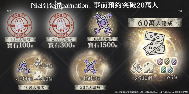 目前《NieR Re[in]carnation》預約已成功達到20萬人次,成功解鎖獎勵「300個寶石」,當所有目標達成後,更可解鎖免費的4500個寶石(相當於15次轉蛋)、3張高級轉蛋券與大量養成素材獎勵。