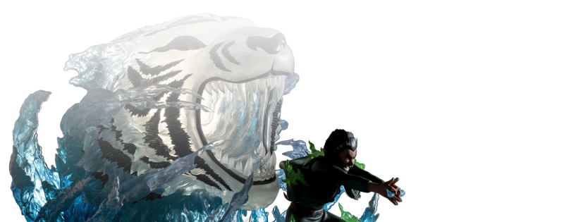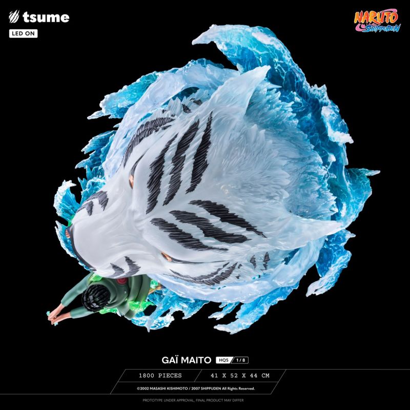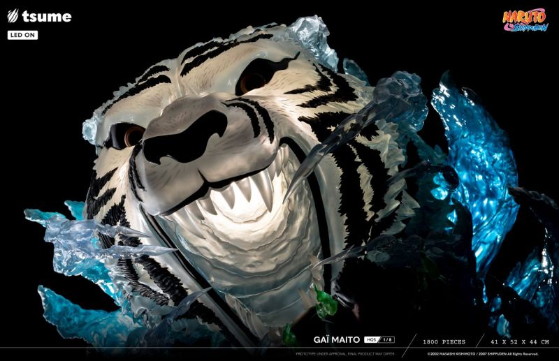 本次 Tsume-Art 的「HQS 阿凱(邁特凱)」(Gaï Maito)1/8比例場景雕像,以阿凱老師與鬼鮫戰鬥時,在海中開啟八門遁甲中的第七門·驚門,使出高級體術——晝虎的精彩瞬間立體化!尺寸全高約 44 公分,深度更是有 52 公分,超高速空壓拳一口氣擴散,形成如老虎一般的超強勁空氣炮,張著利牙大口的虎頭,細細刻劃出毛髮和銳利的雙目,內部更置有LED光效,打造氣魄模樣!而頸部漸層為驚滔駭浪的水花,在籃色透明件中展現出勢不可擋的威力、十足逼真的浪花!
