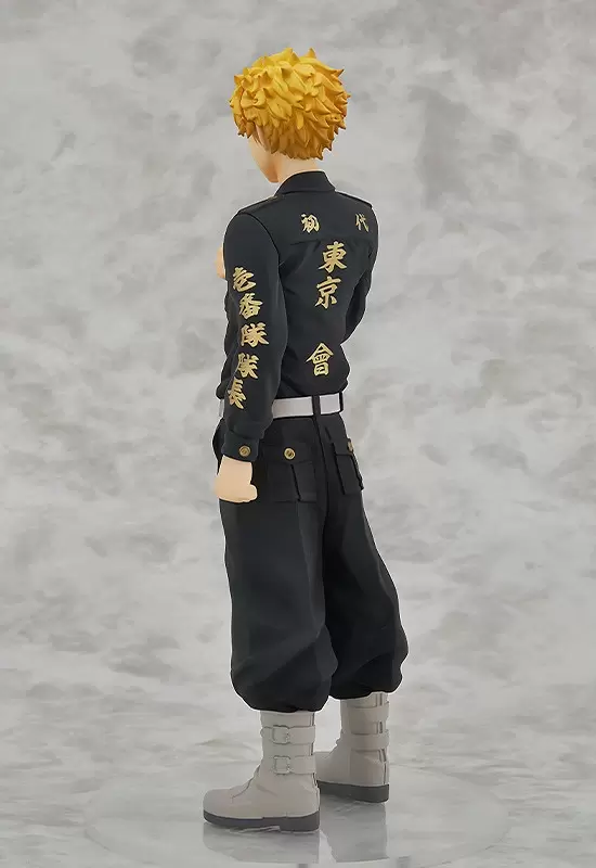 「POP UP PARADE 花垣武道」PVC塗裝完成模型,尺寸全高約 17.5 公分,將武小道成為壹番隊隊長後,下定決心的堅毅神情還原,身穿東卍的特攻服,細膩金色塗裝的「初代東京卍會」、「壹番隊隊長」、「天上天下唯我獨尊」等字樣,並將左手放在胸前!有別於常見的飛機頭,採用頭髮放下來的造型,呈現出絕對不能再退讓的氣魄。