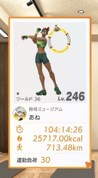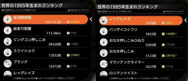 《健身環大冒險》部分,她針對每個項目都有訂定所需的組數跟必須完成的量,遊玩總共 104 個小時,多項排名也在登錄的同齡玩家上排名躍升。