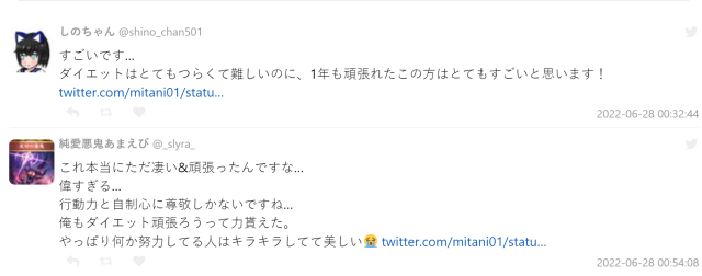 當然像推主這樣的例子其實不少,不過透過插圖來記錄自己一年來的努力,也難怪讓不少推特網友關注。小編也真的佩服推主這樣有毅力的執行減肥計畫,螢幕前想減肥的電電夥伴,不妨也試著動起來吧 ~ XD。