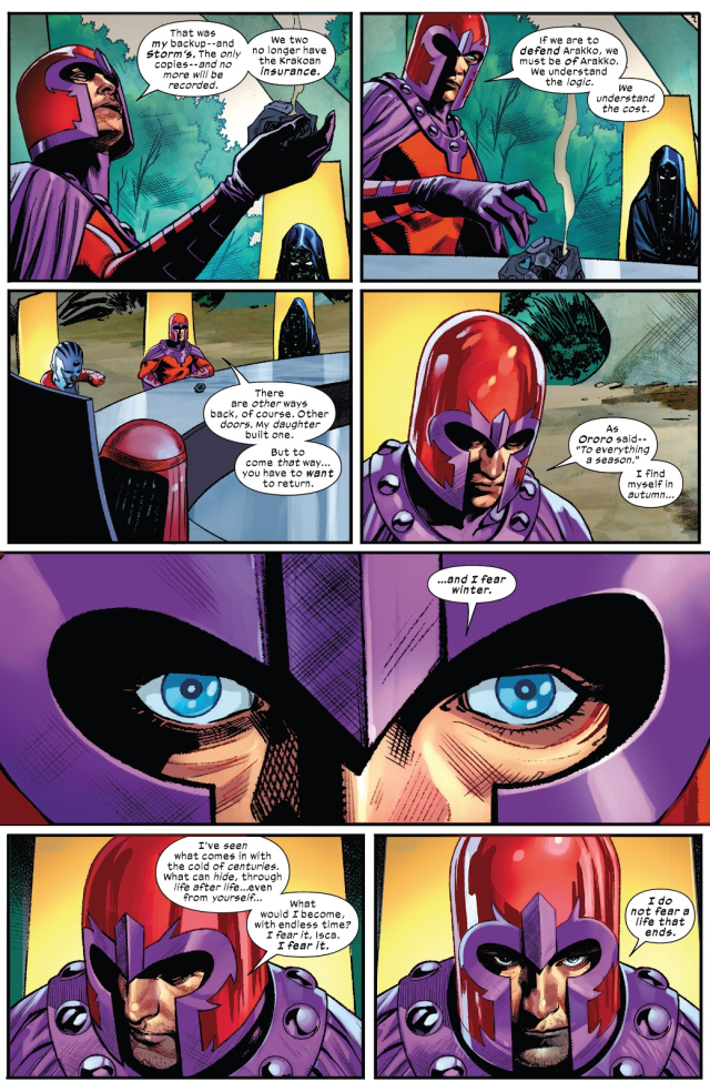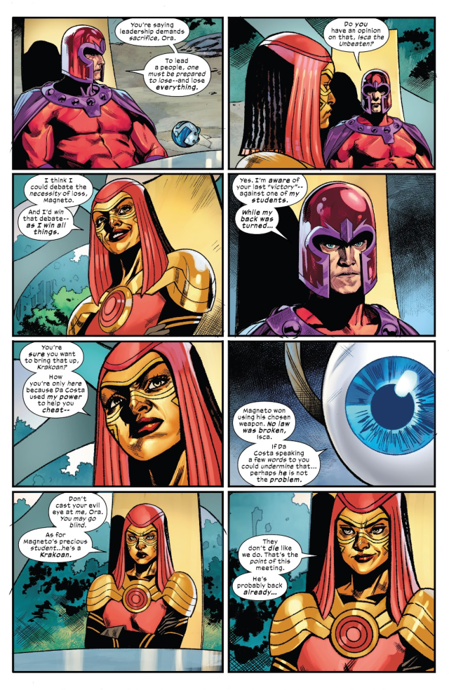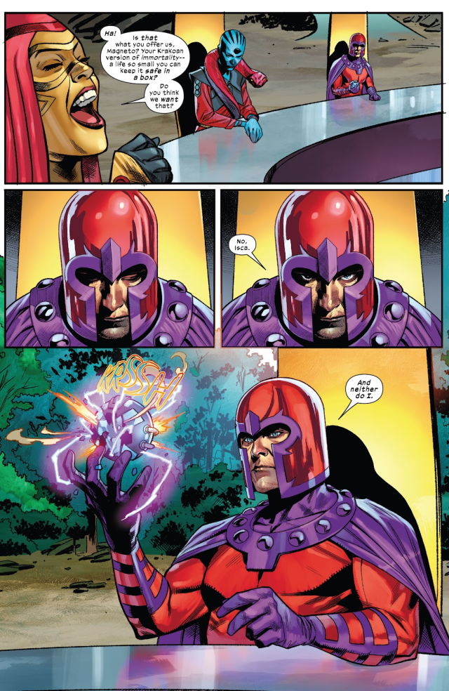 但是打敗了先前坐在「落敗之席」(Seat of Loss)上的「無情者」塔恩(Tarn the Uncaring)的萬磁王身為一位能夠被復活的克拉科人(Krakoan),卻因此遭到不畏懼死亡的阿拉科人(Arakkii)所鄙視,認為他們就算因挑戰議會成員而死也不需要真的付出什麼代價。