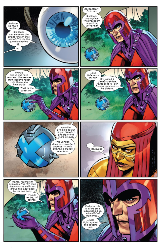 對於「律法之席」(Seat of Law)的Ora Serrata the Witness來說,決定克拉科人是否被允許坐在阿拉科議會的席位上是一件至關重要的事情。而萬磁王對此也是有備而來——他帶來了一個「腦波儀硬碟」。與本體不同,這個版本只能用來存放特定版本的變種人靈魂,也就是讓克拉科人得以復活的關鍵。