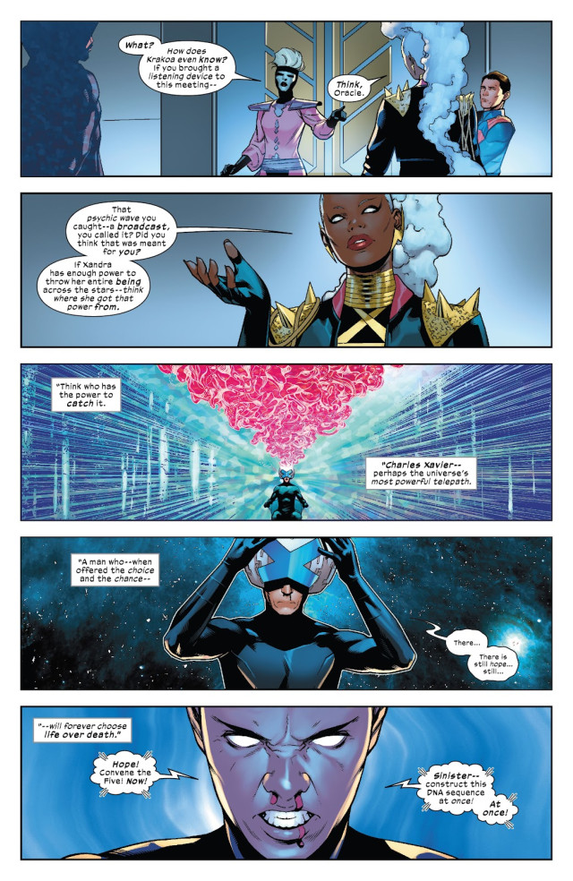 在萬磁王面對巨輪成員的同時,身為太陽系代表的暴風女也在面對銀河議會。由於X教授的女兒,希阿帝國女皇Xandra Neramani最近被帝國當中的秘密派系「緋紅之族」(Kin Crimson)被刺殺,她的副官神諭(Oracle)被迫召集議會討論後續事宜。但是Xandra在死去的那個瞬間透過自父親繼承的能力將自己的一切——記憶、基因情報——全部傳過了整個宇宙給X教授。