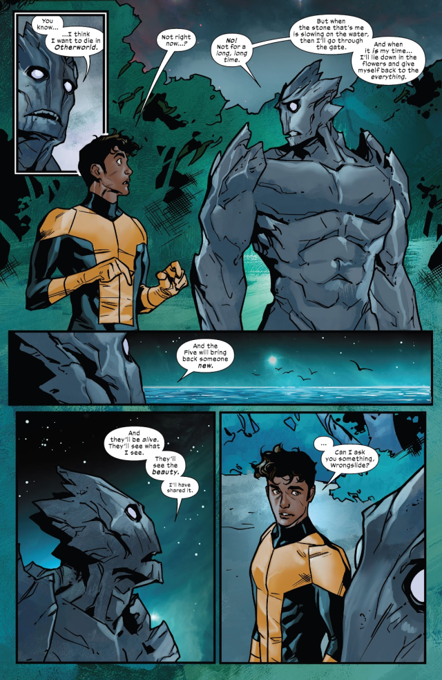 而先前第一位死在異界(Otherworld)後被復活,並因此發現復活程序會因此發生錯誤的變種人「岩崩」(Rockslide)終於獲得了說話能力,並被取了個新的名字「誤崩」(Wrongslide)。