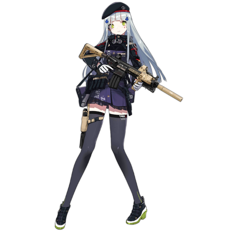 HK416原型是黑特勒-科赫生產的 HK416 突擊步槍,在遊戲中設定為身材纖細的隱乳美少女,臉上掛著可愛的淚痣。隸屬 404 小隊,性格沉默寡言,就算在同伴面前會比較多話,也大多都是毒舌,但是作戰能力出色,戰鬥時給人可靠的感覺。