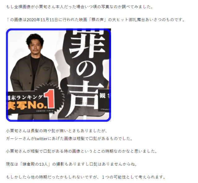 也有人表示,即使照片是真的,但就從圖片中的造型,與小栗旬他目前在大河劇《鎌倉殿的13人》(鎌倉殿の13人)的造型有所不同,因此也不能輕易斷言這是最近所發生的事情,但不管事情是否為真,也都有待商榷。