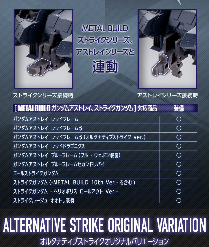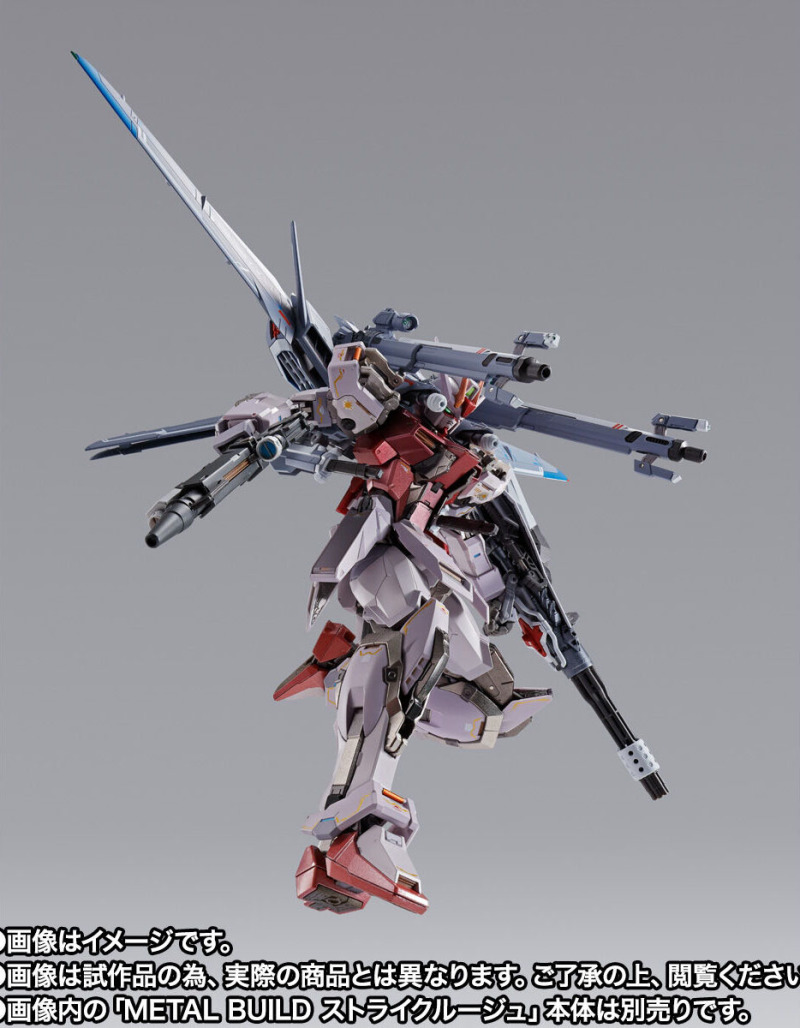 連接 MS 背部的零件設有兩種接頭,不僅是原作設定的攻擊鋼彈,更能讓 METAL BUILD 系列推出的多架異端鋼彈紅、藍色機進行裝備、使用豐富的武裝。阿久津潤一也在此商品中加入多數 MB 原創機構,像是兩把 9.1m 對艦刀能夠連接劍柄組成雙刃刀形態、讓 I.W.S.P. 具備單獨飛行能力甚至能與另售的鳳凰裝備合體成 AI 控制型支援戰機的「EW飛行形態」,甚至是盾牌成為腳架、讓 MS 使用整個背包進行瞄準射擊的「全彈發射形態」!