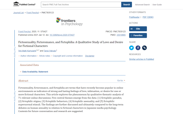 這是先前美國《紐約郵報》(New York Post)於2022年4月時,針對近藤顯彥與初音未來的「跨次元婚姻」所做出的專題報導。而其中內文提到了美國國家衛生院(National Institutes of Health,縮寫為NIH),曾對此發表過一篇論文,表示對於某人迷戀虛擬人物這樣的戀情,不僅的確能夠被歸類為是LGBTQ+的一員,甚至也可以被視為是無性戀者,其理由也是因為這樣的人並不會與真人發生任何性關係。