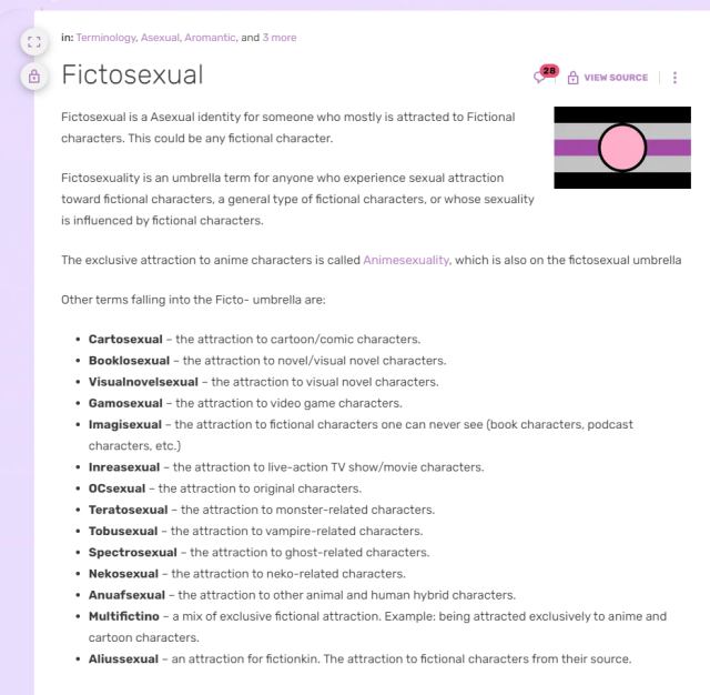 例如喜歡卡通人物的,就叫做「Cartosexual」;喜歡小說人物的,就稱為「Booklosexual」;而迷戀電玩角色的人,則可稱呼為是「Gamosexual」,當然對於Fictosexual者來說,也有專屬的代表旗幟。