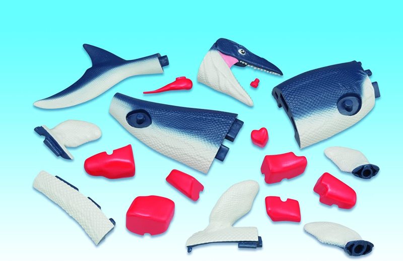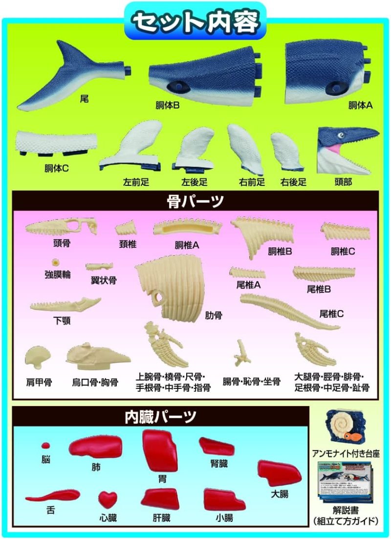 「滄龍復元拼圖」由 35 塊零件組成全長約 22 公分的滄龍,造型沒有過於寫實,和過去系列商品一樣有著水汪汪的大眼睛,相當可愛。35 塊零件中包含 9 塊體表零件、17 塊骨骼零件、9 塊內臟零件,內附有對應四種語言的說明書帶你認識每塊骨骼、每顆內臟的名稱,一塊塊從內到外復元整隻滄龍的身體構造,能夠學習到豐富知道,還能使用菊石造型的台座來展示!